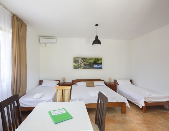 Our Basic Studio No.3 is a spacious room which accommodates up to 4 people. Settled on the ground floor with the size of 28m2. It has a King size bed, 2 Sigle beds, Wardrobe, Kitchen, Dinning area, Private bathroom and terrace.