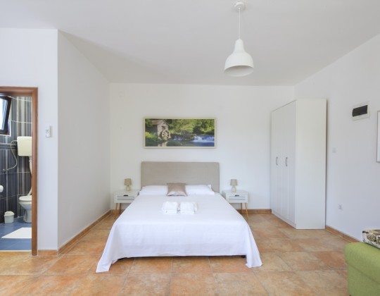 Our Garden View Studio No.1 is a spacious room which can accommodate up to 4 people. Settled on the ground floor with the size of 28m2. It has a King size bed, a Sofa bed, Wardrobe, Kitchen, Dinning area, Private bathroom and terrace.